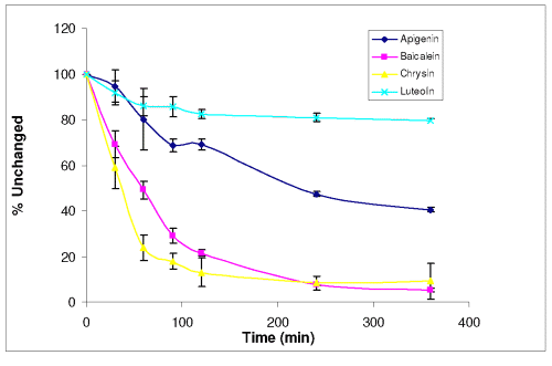 Figure 2: Stability profiles of Apigenin, Baicalein, Chrysin and Luteolin (40 mM) (n=3).