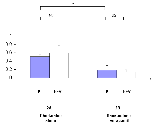 Figure 2: Effect of efavirenz (EFV) on the clearance of rhodamine 123 (Rh), expressed as the percentage of rhodamine 123 transported across rat everted gut sacs without (2A, n=6) or with a P-gp blocker (verapamil) (2B, n=7) per minute. Grey columns represent rhodamine 123 transport in control rats non pre-treated with EFV (K) and white columns represent rhodamine 123 transport in rats pre-treated with EFV (150 mg/kg during 6 days) (EFV) (m +/- s.d.). *: p<0.05 ; NS : non significant