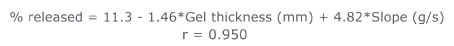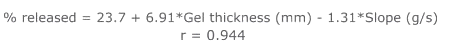 Finally, the influence of matrix swelling, gel layer thickness and the slope (gel strength) of the force-distance curve on the release of theophylline was evaluated by multiple regression analysis using "Minitab 14.10" software (26). The percentage of theophylline released was found to be dependent on these parameters according to the following equations obtained by multiple regression analysis: