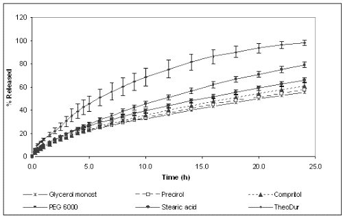 The type of excipient influenced the rate and extent of drug release from melt granulation based matrix tablets. Comparison of dissolution profiles indicated that only the formulations containing HPMC K4M and Gelucire® 50/13 or PEG 6000 had a profile similar to the commercial formulation studied. However, the release of theophylline was remarkably lowered when liphophilic binders were used.