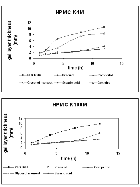 Figure 5 summarizes the results obtained for the hydration process of theophylline matrices based on HPMC K4M or K100M as a function of time of exposure to an aqueous environment.