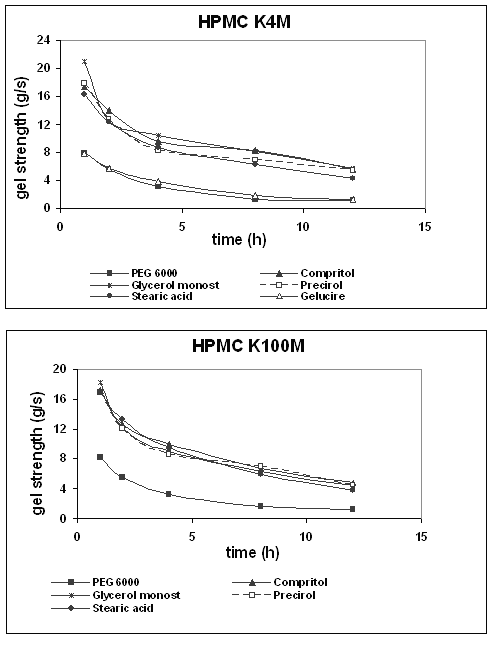 After 12 h swelling, the slopes were 1.1 and 4.5 g/s and the maximum penetration distances were 10.5 and 3.5 mm for PEG 6000 and Glycerol monostearate, respectively. These differences can be attributed to the lower hydration and bigger gel strength of the HPMC with lipophilic binder.
