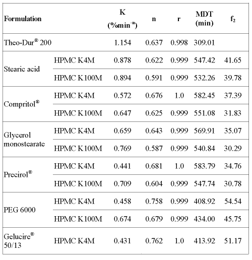 Release data from swellable HPMC systems can be analyzed according to Peppas's equation. The values of the kinetic parameters obtained from the data fitting to the power law equation (Eq. 1) and MDT (Eq. 2) are listed in table 2.