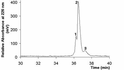 Borosilicate glass ampoules are usually sealed by heating. Although this is a very rapid process, drugs must be very stable to efficiently retain the stability during and after heating. Here, we evaluated the effect of the sealing of ampoules by heating, after dispensing 1 ml of the rhIFN-a2b solution. Results obtained by RP-HPLC showed three degradation by-products which affected the purity of the native rhIFN-a 2b peak (Fig. 1 A, B).