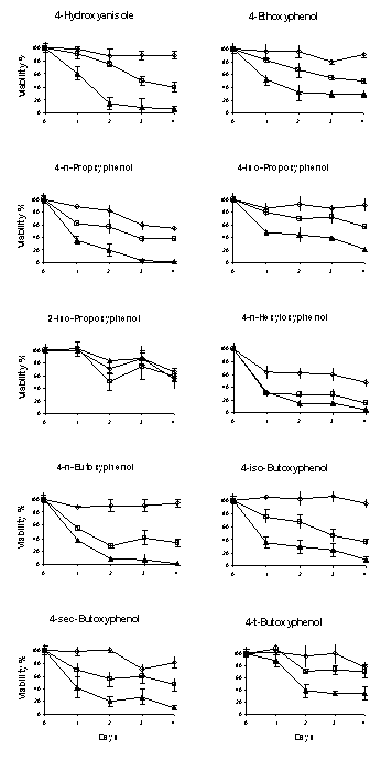 2-iso-propoxyphenol. 4-n-Hexyloxyphenol demonstrated the greatest toxicity