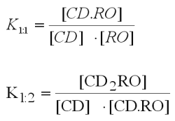 Both cyclodextrins show a straight line, which means that these CDs form complexes with RO of 1:1 and 1:2 stoichiometries. Stability constants (K 1:1 , K 1:2 ) were calculated by solving equation 2 and are reported in Table 1.
