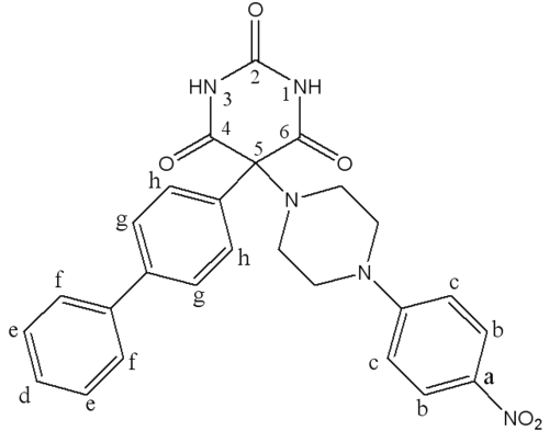 The nitrophenyl group is included by DIMEB with primary hydroxyls oriented towards the piperazin cycle, whereas the biphenyl group is included by a second DIMEB molecule, but with two possible inclusion directions, primary or secondary hydroxyls oriented towards the barbituric ring (Figure 6).