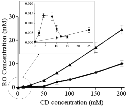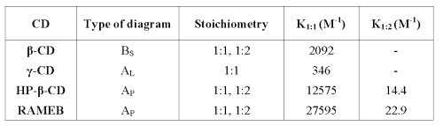 The g-CD shows an AL diagram (r2=0.99), and because the slope is lower than 1 (4.10 -4), the complex stoichiometry is most probably 1:1. The stability constant is determined by equation 1. The low stability constant value means that interactions between RO and g-CD are weak, probably because the CD cavity is too large to include RO tightly.