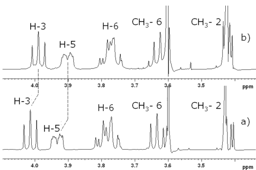 Figure 4: Partial 1H-NMR spectra of 10 mM solutions (a) DIMEB in presence of RO and (b) DIMEB in D2O with assignment of the signals of the CD.