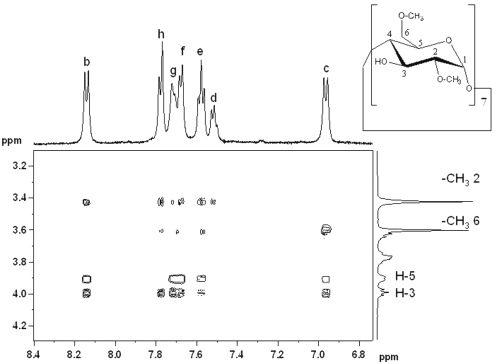 Correlation spots indicated interactions between b, c, e, f, g and h RO protons and H-3 and H-5. Other interactions between RO protons and DIMEB -CH3 6* and 2* (corresponding to primary and secondary hydroxyl faces respectively) were observed. On the one hand, H-b only interfered with -CH3 2*, whereas H-c only showed correlation spots with -CH36 * . On the other hand, all biphenyl protons interfered with -CH 3 2 * and 6 * . All these observations suggest that both barbituric substituents of RO are complexed by DIMEB.