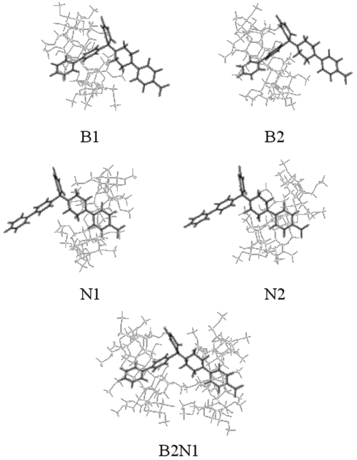 The piperazin cycle can take boat or chair conformation and sp3 nitrogen substituents can switch from the axial to the equatorial position. A DIMEB conformer has been built and optimized from an "opened" b-CD, in order to be able to load RO substituents. Since two subunits of RO can be included using DIMEB, five possible models were optimized. To facilitate understanding, these different structures were numbered. For models B1 and B2, the biphenyl group is included inside the cavity of the DIMEB, whereas N1 and N2 correspond to the inclusion of the nitrophenyl group.