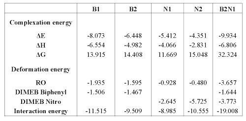 The results show that both biphenyl inclusion modes form a stable complex (DE < 0). Even if B1 complexation energy is higher than B2 value, the entropy is similar for both complexes.