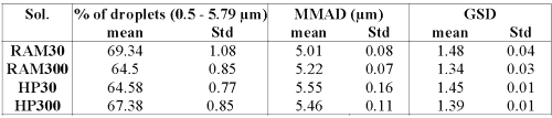 Table 5: Percentage of droplets in the range of 0.5 to 5 mm, mass median aerodynamic diameter (MMAD) and geometric standard deviation (GSD).