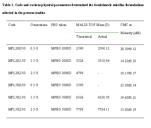 dilutions. The dendritic carriers were found to form stable micelles at 10-30 mg/ml (lower