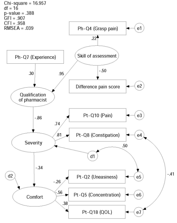 The final model and correlation matrix are shown in Figure 3 (model 3) and Table 5, respectively. In the model 3, one calculated parameter was introduced to make reasonable model, that is, absolute value of difference of pain scores answered by patients and assessed by pharmacists. This parameter would express a level of pharmacists’ skill to assess pain level of patients, because when the parameter is 0, the pharmacist can assess the patients’ pain exactly. The statistics of goodness-of-fit parameters of model 3 were all satisfactory to be GFI=0.907, CFI=0.958, RMSEA=0.039, SRMSE=0.1192 and chi-square=16.957 (df=22, p=0.388).
