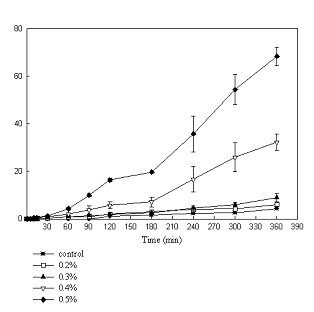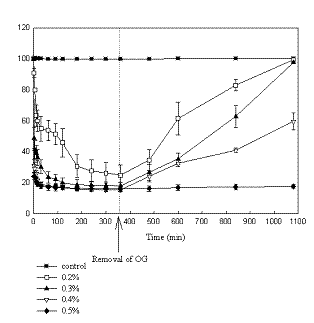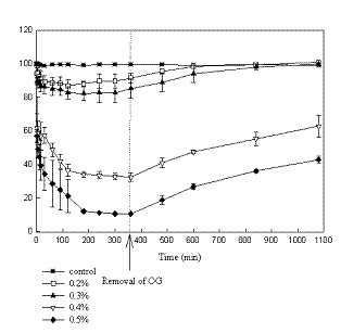 Both figures indicate that after a sharp fall, resistance continued to decrease over the six hour exposure period. The lower concentrations of 0.2% and 0.3% OG had less effect on Caco-2 cells than on T-84 cells. Higher concentrations exceeding 0.5% showed similar effects on both cells lines decreasing resistance by around eighty percent.