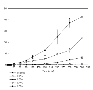 Previously thirteen alkylglycosides were evaluated for potential use as permeability enhancers using epithelial cells of which OG was found to be a promising candidate (14). In this present study, Caco-2 and T-84 monolayers were used to further evaluate the penetration enhancing effects of OG. To assess the effect of short term exposure both monolayers were treated with OG at 0.1% to 1% for 1 hour (data not shown). There was an immediate decrease in TEER compared to controls at these concentrations after 1 minute. At 0.1% after the initial fall, an increase in TEER was observed which could be due to low lipid to surfactant ratio resulting in surfactant binding to cell membrane causing stabilization (18). At higher concentrations, after an immediate fall, TEER continued to decrease over the exposure period. TEER was restored to its original value after removal of OG demonstrating a reversible effect when applied at 0.1% - 0.5% indicating optimum concentration range for this exposure time. The effect of OG also depends on time of exposure. The results using both monolayers exposed to OG for 6 hours are shown in figures 1 and 2. A concentration-dependent effect is evident on resistance across both monolayers showing an immediate fall followed by prolonged reduction.