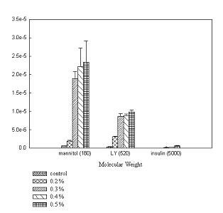 OG was applied in conjunction with paracellular markers to qualify its effect on paracellular permeability. In the absence of OG a low baseline permeability was observed with negligible amounts of both markers. The Peff values of markers across Caco-2 monolayers in controls was found to be in the same range as that observed by other investigators (20, 21). No significant difference in permeability of markers was observed at concentrations below 0.1% w/v compared to control. At concentrations ≥ 0.1%w/v, a noticeable improvement in the permeability of the marker was observed.
