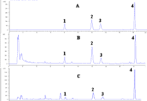 In order to achieve quantitative extraction, variables involved in the procedure such as solvent, extraction method and extraction time were optimized. A series of solvents such as methanol (MeOH), methanol:chloroform (CHCl3) (7:3, 5:5, 3:7, v/v) and CHCl3 were tested as the extraction solvents of tanshinones (23-25). The best solvent was found to be a mixture of MeOH: CHCl3 (7: 3, v/v) (Table 2), which allowed extraction of all the tanshinones in high yield. MeOH or CHCl3 alone were not efficient for the complete extraction of the four compounds of interest.