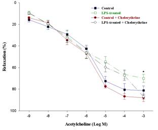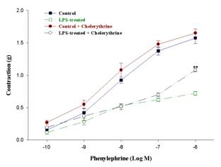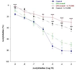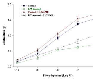 In this study, we investigated the effect of NO pathway, by blocking NO synthase with L-NAME and of PKC pathway, by blocking with chelerythrine, on the responsiveness of the isolated aortic rings of LPS-treated rats to vasoconstrictor agent (Phenylephrine) and an endothelium-dependent vasodilator (Acetylcholine) and an endothelium-independent vasodilator sodium nitroprusside.