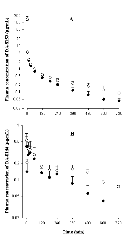 The concentrations of DA-8159 and DA-8164 in the above biological