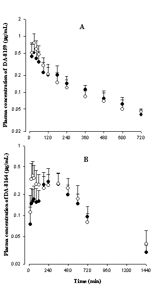 of DA-8159 after oral administration of DA-8159 could be due to changes in