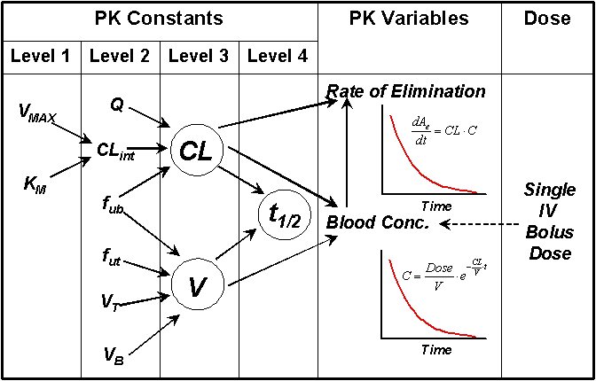 The arguments presented here are summarized in Figure 5 in terms of hierarchy of the major pharmacokinetic parameters (constants) and their interdependence. Furthermore, the effects of these kinetic parameters on the blood concentrations and elimination rate after a single intravenous dose are demonstrated.