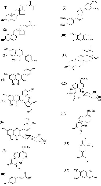 The hexane fraction from the stems and leaves (4.70 g) was chromatographed on silica-gel column with hexane:EtOAc gradient, giving a solid which was successively recrystalized from ethyl acetate/methanol to yield a mixture of b-sitosterol (1) and stigmasterol (2) (14.0 mg).