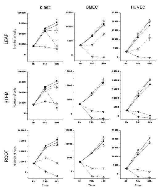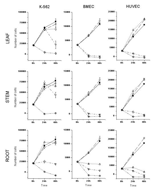 Figure 1: Cytotoxic activity of A. schottii ethanolic extracts on the in vitro proliferation and survival of leukemic and endothelial cells. Ethanolic leaf, stem and root extracts were assayed against three different cultured cells: K-562, a cell line derived from Chronic Myeloid Leukemia in blastic crisis; BMEC, primary bone marrow endothelial cells; and HUVEC, primary human umbilical cord endothelial cells. The number of viable cells was determined after 24h and 48h of culture, by MTS colorimetric assay. ■, control; ○, 0.4% DMSO; ∆, 8 ug/mL of extract; Ñ, 80ug/mL of extract; ◊, 400 ug/mL of extract. Each point represents the mean ± SD number of cells from three independent wells