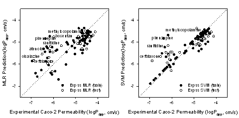 In this study, Caco-2 permeability prediction models based on MLR and SVM methods were built. All of the molecular descriptors involved were calculated by open source software, CDK and statistical work was done by open source software, R. Open source means that the software is free and the users can read, modify and add functions to the source code freely. This means those who want to validate or use the models described here to predict Caco-2 permeability from the chemical structure can do so. Furthermore, the models provided some insight into physiochemical process. Because Caco-2 penetration mentioned here was passive transport, metabolism and active transport was out of the scope of this study.