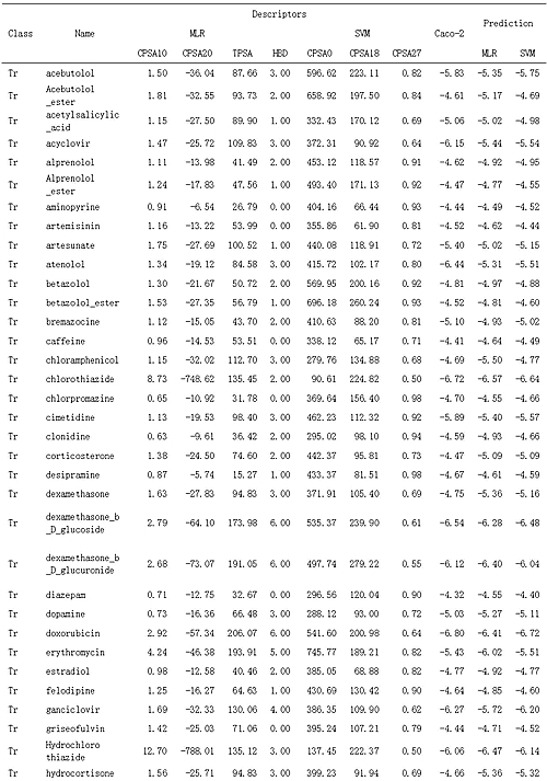 The experimental apparent Caco-2 ........ permeability(logPapp) data of 100 drugs was collected from the literature (23). To compare with Hou et al’s work, the data set was separated into a training set of 77 compounds and a test set of 23 compounds as in Hou et al (23). The training set was used to build model, and the test set was used to evaluate its predictability. The experimental apparent permeability, the molecular descriptors used in this study and the results predicted by the multiple regression model (MLR) and the support vector machine (SVM) model were listed in Table 2.