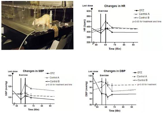 DTZ given at 10 mg/kg s.c. twice daily for 5 doses was well tolerated by the animals which were able to complete fully the described exercise test. At 1 hour after the last dose, it decreased SBP before exercise from 115 ± 1 to 96 ± 2 mmHg (-17%), DBP from 97 ± 2 to 70 ± 2 mmHg (-28%), and HR from 439 ± 5 to 391 ± 9 bpm (11%) (p < 0.05 for all variables), but had minimal effect on plasma concentrations of norepinephrine (1.4 ± 0.3 vs 1.9 ± 0.9 ng/mL), or epinephrine (0.76 ± 0.11 vs 0.84 ± 0.10 ng/mL) (p > 0.05). Exercise increased SBP from 108 ± 2 to 131 ± 3 mmHg (21%), and HR from 437 ± 6 to 503 ± 6 bpm (15%), and plasma epinephrine concentrations from 0.94 ± 0.13 to 5.8 ± 1.7 ng/mL in control rats (p < 0.05 for all variables), but had less effect on DBP (81 ± 5 vs 87 ±6mmHg) & plasma norepinephrine concentrations (1.5 ± 0.2 vs 3.9 ± 0.4 ng/mL). In DTZ treated rats, SBP was increased from 96 ± 2 to 103 ± 2 mmHg (7%), HR from 391 ± 9 to 433 ± 9 (11%) (p < 0.05), and epinephrine and norepinephrine from 0.84 ± 0.1 to 4.7 ± 1.9 ng/mL, and 1.9 ± 0.3 to 5.1 ± 1.9 ng/mL, respectively.The increases in catecholamine concentrations attributed to DTZ were not significantly different from the increase due to exercise. In contrast to the slight increase in the control rats, DBP was decreased from 70 ± 2 to 64 ± 4mmHg(-10%) during exercise in the DTZ treated rats, and continue to decrease immediately post exercise(Fig.1).The neurohormone & hemodynamic variables gradually returned to pre-exercise level shortly after exercise (Figures 1 and 2).