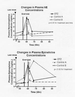 Previous studies have shown that a single 20 mg/kg dose of DTZ administered systemically decreased blood pressure (SBP and DBP) and heart rate (HR) in normotensive rats, and that the effects were greater on the DBP than the SBP (-50% vs – 20%) (21 , 22). A similar hemodynamic effect of DTZ was also evident in the current study when it was administered subcutaneously at 10 mg/kg twice daily for 5 doses although the effects were significantly smaller (-28% vs -17%). These differences could be attributed to the different plasma concentrations of DTZ and its active metabolites attained after the two different dosages and mode of administration (21). The current study has also demonstrated that exercise increased BP, HR, and plasma concentrations of epinephrine in rats (Table 1, Figures 1 and 2) which are consistent with the previous results reported by other workers (23). The fact that DTZ lowered BP and HR, but had no effect on the increase of plasma concentrations of norepinephrine and epinephrine, prior to and in response to exercise, would suggest that it has minimal effect on neurohormone or sympathetic activation, and that there is no synergistic effect between exercise and DTZ as was demonstrated for cocaine in the study by these workers (23). An earlier study of DTZ using a congestive heart failure dog model by right ventricular pacing has shown that a 0.8 mg/kg dose of DTZ increased plasma concentrations of norepinephrine induced by pacing without affecting the HR response (24). The reasons for the discrepancy is not clear although it may be related to the different animal models employed and that sympathetic activation was induced by a different mechanism (exercise vs ventricular pacing).