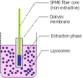 ABSTRACT: Purpose. An important step in the development of liposome-based formulations is estimating the free drug concentration in the aqueous solution surrounding liposomes. This research presents a new method for determination of free concentrations, based on membrane-protected solid-phase microextraction (SPME). Methods. For effective direct extraction of low molecular weight compounds from complex liquid samples, a hollow membrane was used to form a concentric sheath around a coated SPME fiber. The membrane blocked the access of large particles, like liposomes, to the coating surface, while target analytes with low molecular weight diffused through the membrane and reached the extraction phase. Quantification was conveniently performed by reversed-phase liquid chromatography coupled to electrospray ionization mass spectrometry. Results.The carbowax/templated resin SPME fiber was determined to be the most suitable for these assays, providing enough sensitivity when an extraction time of one hour was used. The free concentration of paclitaxel was found to be 0.36 µg/mL, significantly below the solubility limit of paclitaxel in water. Conclusion. The method was successfully applied for determining free paclitaxel in liposome formulations based on dioleyl-trimethyl-ammonium-propane, with good linearity over the range of concentrations of interest. The method was faster and more practical than equilibrium dialysis, as the SPME approach provided preconcentration and convenient delivery to the analytical system.