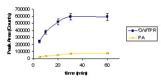Figure 3. Extraction time profile for paclitaxel (0.3 μg/mL standard solution, no liposomes) by direct SPME with two different coatings: CW/TPR and PA.