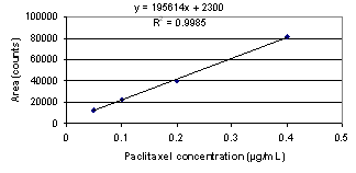 Consequently, one hour extraction time was used for constructing a calibration curve and determining the concentration of free paclitaxel. Calibration was performed over the range of 0.05 – 0.4 μg/mL, that completely covers the expected range of free concentration values (Figure 5).