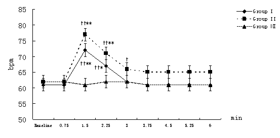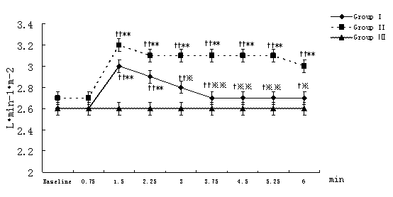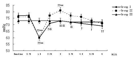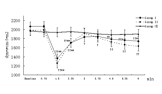 Compared with group II at the same time point, group I had some significant differences: lower MAP (P<0.01 or P<0.05) at 2.25, 3, 3.75 minutes time point (In fact, compared with the baseline, MAP decreased in group I, while increased in group II) and lower CI (P<0.01 or P<0.05) at and from 3 minutes time point. (Figure 1)