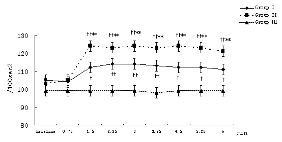 Figure 1-5. Data are expressed as mean ± SD. The baseline hemodynamic values had no significant difference between Group I, Group II and Group Ⅲ. †P<0.05, ††P<0.01significant difference compared with baseline data within each group using repeated-measures ANOVA. ﹡P<0.05, ﹡﹡P<0.01 significant difference compared with data of group Ⅲ at the same time point in Group I or Group II using ANCOVA.. ※P<0.05, ※※P<0.01 significant difference compared with data of group II at the same time point in Group I using ANCOVA. MAP (mmHg) =mean arterial pressure; HR (bpm)=heart rate; CI (L·min-1·m-2)=cardiac index; SVRI (dyn·s·cm-5·m2) =systemic vascular resistance index; ACI(/100sec2) =acceleration index.