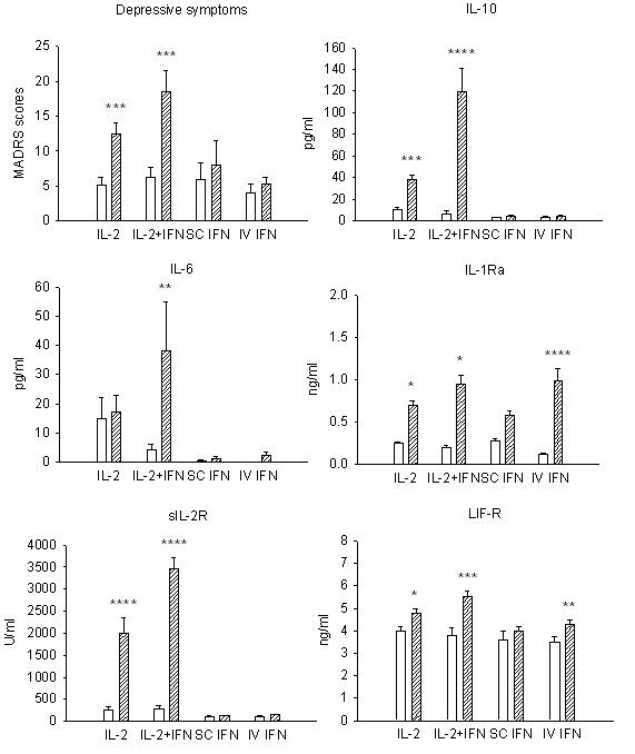 Figure 1. Patients treated with IL-2 or IL-2 plus IFN-a have increased cytokine levels and concomitant mood disturbances during treatment. Increased IL-10 expression reflects presence of an inflammatory response. Changes in MADRS scores and cytokine serum concentrations between baseline (blank bar) and fifth day of therapy (stripped bar) in each treatment group [IL-2 (n=13), IL-2 + IFN (n=5), SC IFN (n=5), IV IFN (n=10)] means ± SEM. ****p<0.0001; ***p<0.001; **p<0.01; *p<0.05. From reference 20 with permission.