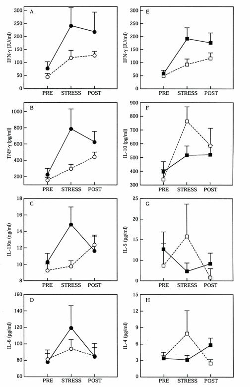 Figure 2. Measurements of serum cytokines greater than one month before (PRE) and after (POST), and one day before (STRESS) a difficult academic examination. The medical students were divided depending on their stress perception as high (n) and low (O) (A-D) and students with high (g) versus low (c) anxiety responses (E-H). Values are mean and standard error of the mean. From reference 53 with permission.