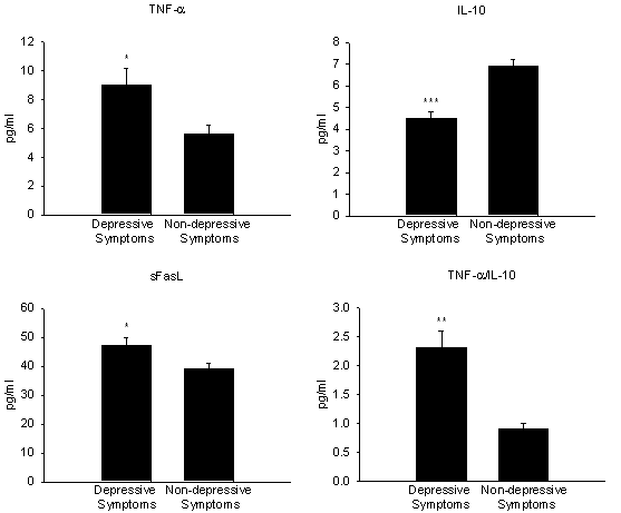 Figure 3. Differences in plasma levels of circulating TNF-a, IL-10, sFasL and TNF-a/IL-10 ratio in depressed (n=15) and non-depressed (n=20) patients afflicted with mild to moderate stable chronic heart failure. Values are represented as means ± SEM. ***p<0.001; **p<0.01; *p<0.05. Adapted from reference 83 with permission.