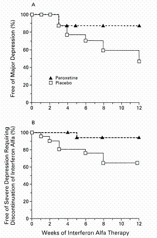Figure 4. Kaplan-Meier analysis of the percentage of patients in the placebo and paroxetine groups who were (A) free of major depression and (B) of severe depression requiring the discontinuation of IFN-a treatment. Paroxetine significantly decreased the incidence of major depression in patients receiving IFN-a therapy. From reference 97 with permission.