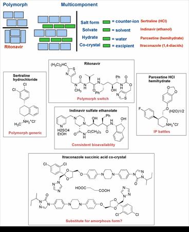 Figure 1. Examples of the types of crystal forms of pharmaceutical compounds used in products along with some issues and opportunities associated with each example
