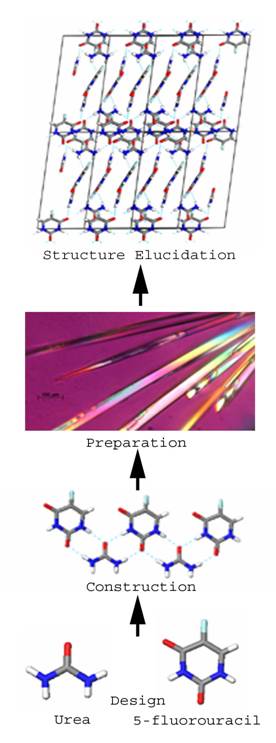Figure 2. Steps involved in crystal engineering of a pharmaceutical phase, exemplified by the real example of co-crystallization of 5-fluorouracil and urea.