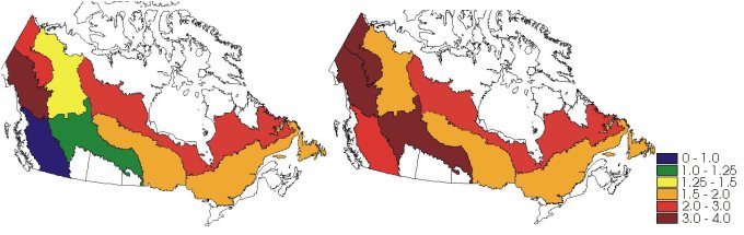 Fig 1. Ratio of 3xCO2/1xCO2 area burned by Ecozone using the Canadian and Hadley GCMs, respectively. N/A, not applicable. The area burned model did not work for one ecozone.