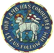 cross is clearly displayed. The inscription reads "Our Lamb has conquered,