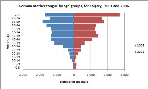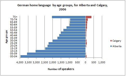 German in the urban areas Compare the same graph with the data for Calgary below. It shows an inverted pyramid with very few children in the lower age groups learning German as their first