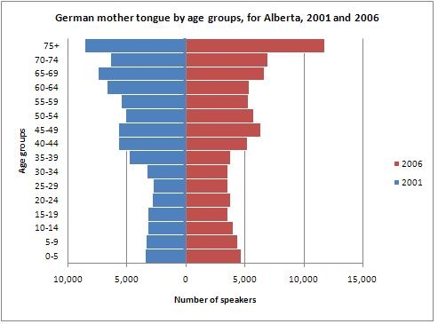 The following graph for Alberta as a whole shows the continued aging of Albertans with German mother tongue on one hand, and an increase in the