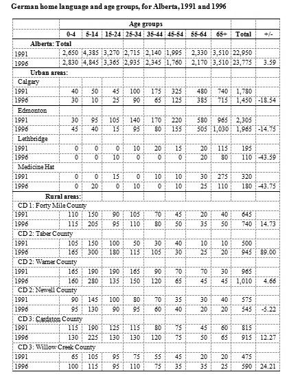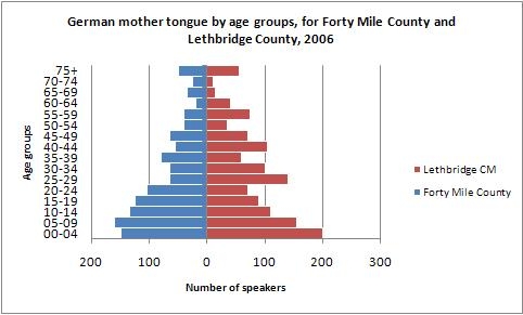 the Town of Taber has relatively large numbers of very young as well as older speakers of German. One may speculate that the distribution reflects the composition of the large,