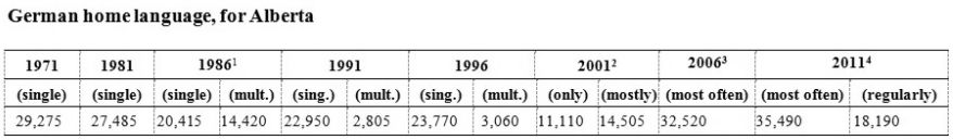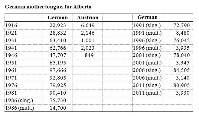 German as a mother tongue. After the immigration boom in the 1950s and 1960s, the number of Albertans who reported German as their only mother tongue reached almost 100,000 between 1961 and 1971; subsequently it dropped to ca. 78,000 in 2001, increased again by some 6,000 individuals to 84,505 five years later and then declined once more to ca. 81,000 persons in 2011; see the table below for the numbers of single and multiple (i.e., German and one or more other languages) responses.